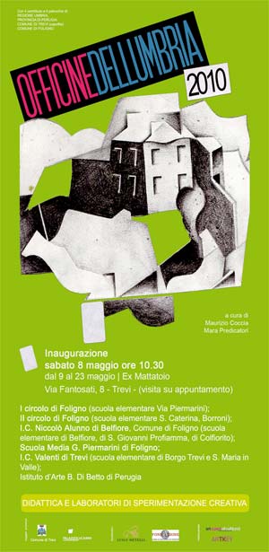 Il progetto si concluderà con l’inaugurazione di due mostre autonome il giorno sabato 8 maggio. Le opere realizzate dai ragazzi saranno infatti esposte nella mostra OFFICINEDELLUMBRIA 2010 presso l’Ex Mattatoio di Trevi, mentre i lavori degli artisti saranno visibili in Premiata Officina Trevana presso il Centro d’arte contemporanea Palazzo Lucarini Contemporary. Quest’ultima mostra è la grande mostra collettiva che chiude il processo iniziato con OFFICINEDELLUMBRIA 2010 coinvolgendo tutti gli artisti che hanno guidato i laboratori didattici. Una mostra unica nel suo genere, che ogni anno rinnova il binomio tra sperimentazione artistica e talent-scouting. Incubatrice di giovani talenti, Premiata Officina Trevana si conferma una ricognizione puntuale del panorama artistico nazionale. Un immancabile punto di riferimento per le tendenze più innovative della creatività, animate da un autentico spirito di ricerca. In mostra circa venti artisti, diversi per provenienza, formazione ed anagrafe: Oscar Accorsi, Rebecca Agnes, Alessia Armeni, Luca Bertini, Alessio Biagiotti, conceptinprogress, DDM, :esibisco., Franco Fiorillo, Armida Gandini, Piotr Hanzelewicz, IMPOSSIBLE SITES dans la rue, Giorgio Lupattelli, Paride Petrei, Giovo Piacentini, Gino Sabatini Odoardi, Studio ++, Lisa Wade. |