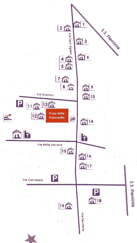 1 Antichità V. M. 2 Umbria Computer Center 3 Centro del Risparmio 4 Caffetteria Mattioli 5 Emporio Menghini - Articoli per la casa 6 Panetteria Verzari 7 Profumeria "La Pantera" 8 Lavanderia Patrizia 9 Sciper - Il Corredo 10 Parrucchieri Alfrida e Walter 11 Centro del Benessere 12 Crilù Tessuti 13 Carta & Co. - Cartolibreria 14 Crilù Mercerie 15 L'Arte del Fiore 16 Mondo Baby 17 Caffè del Borgo 18 Fiori d'arancio - bomboniere 19 MALF ferramenta